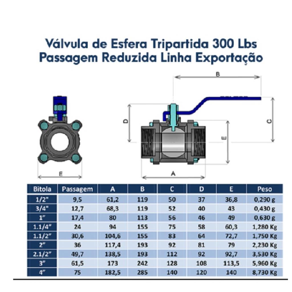 1 - VALVULA ESFERA TRIPARTIDA, PASSAGEM REDUZIDA, CORPO EM AÇO CARBONO, VEDAÇÃO EM TEFLON, CLASSE 300 LIBRAS, CONEXÃO DE 2" - NELMAR
